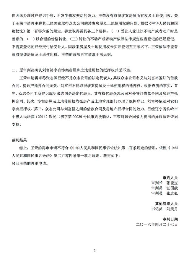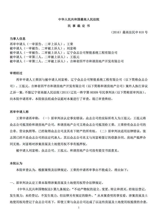 本案再审申请人王荣因与被申请人刘富裕、辽宁众志公司智能系统工程有限公司(以下简称众志公司)、王泓元、吉林省四平市和谐房地产开发有限公司(以下简称和谐房地产公司)案外人执行异议之诉一案,不服辽宁省高级人民法院(2015)辽民一终字第00309号民事判决(以下简称原审判决),向最高法院申请了再审。