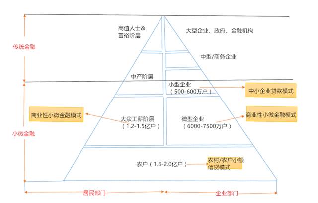 如图所示,客户金字塔的第一、二层(大型企业、中小型企业)都属于商业银行或者说正规金融的目标客户和服务对象,第三层和第四层将是微型金融机构的构建商业性小微金融的主要阵地。包括:1.2-1.5亿户的大众工薪阶层、7500-8000万户的微型企业和自雇经济体、1.8-2.0亿户的生产性农户。